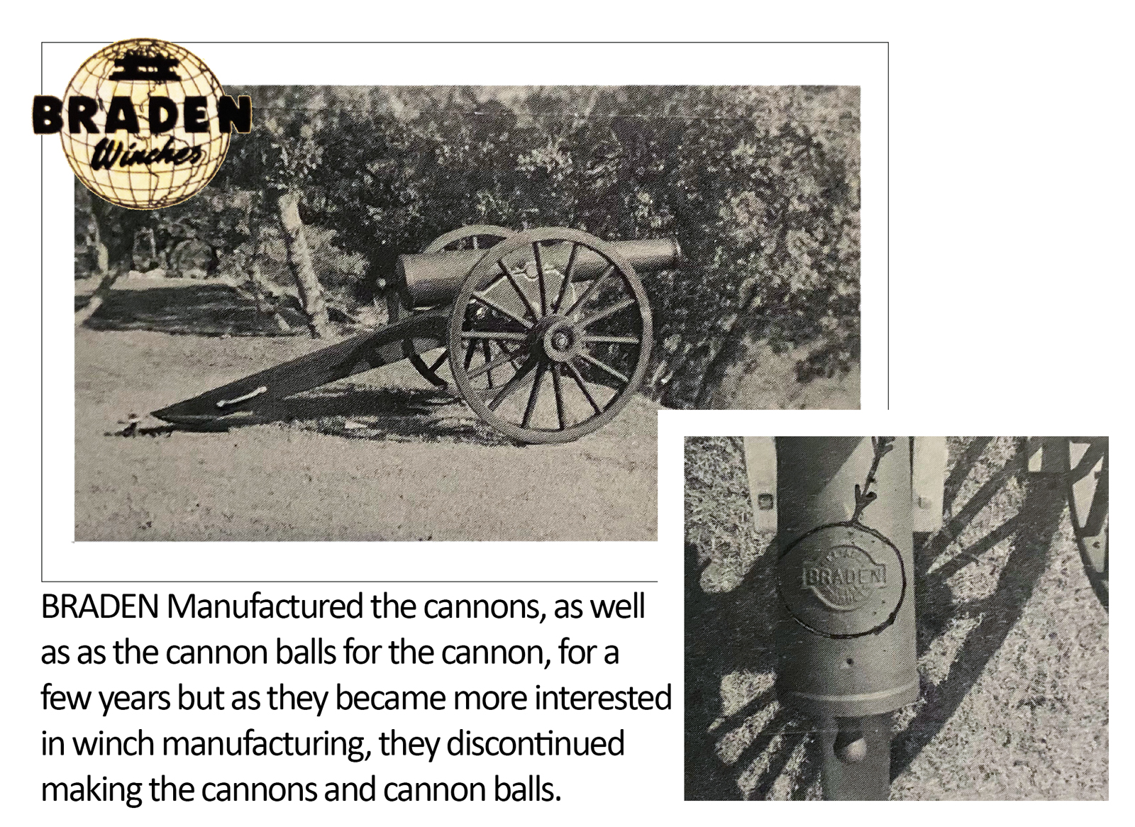 <p>Braden manufactured the cannons, as wells as the cannon balls for the cannon, for a few years but as they became more interested in winch manufacturing, they discontinued making the cannons and cannon balls.</p>
